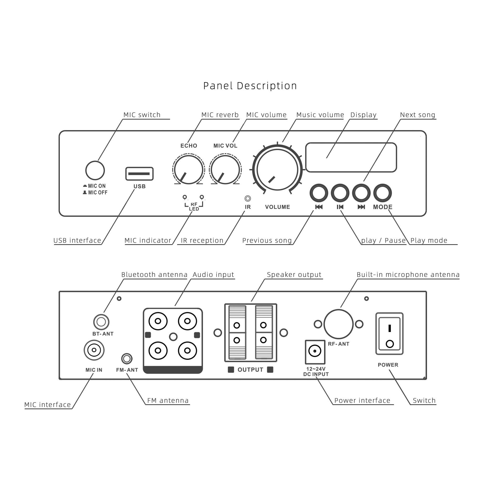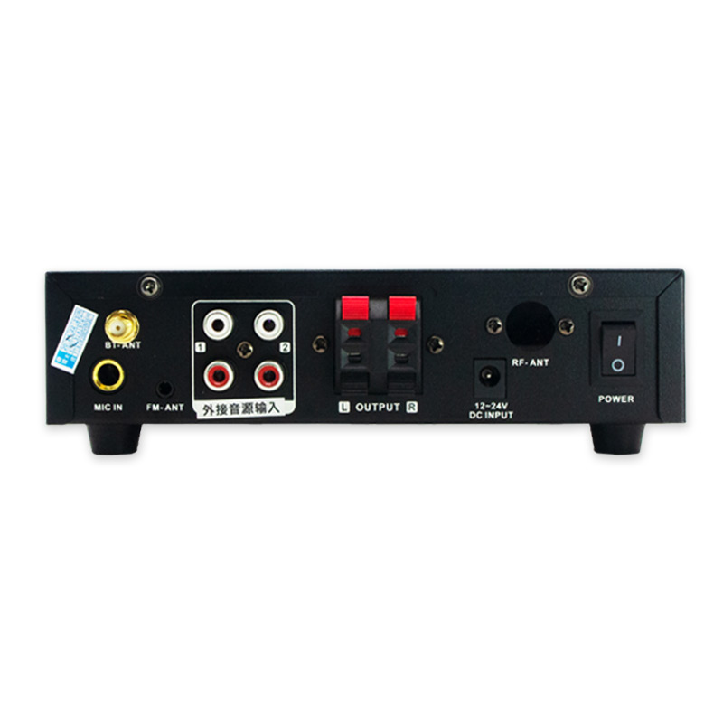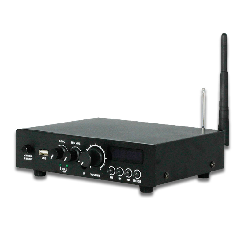 آمپلی فایر تمام اهمی دارای صفحه نمایشگر، دارای کلید ولوم جهت کنترل صدای خروجی، ورودی USB، بلوتوث، رادیو FM، ورودی AUX، خروجی AUX، یک ورودی میکروفن با کلید های کنترلی میکروفن ها، ریموت کنترل IR، ورودی برق 220 ولت AC