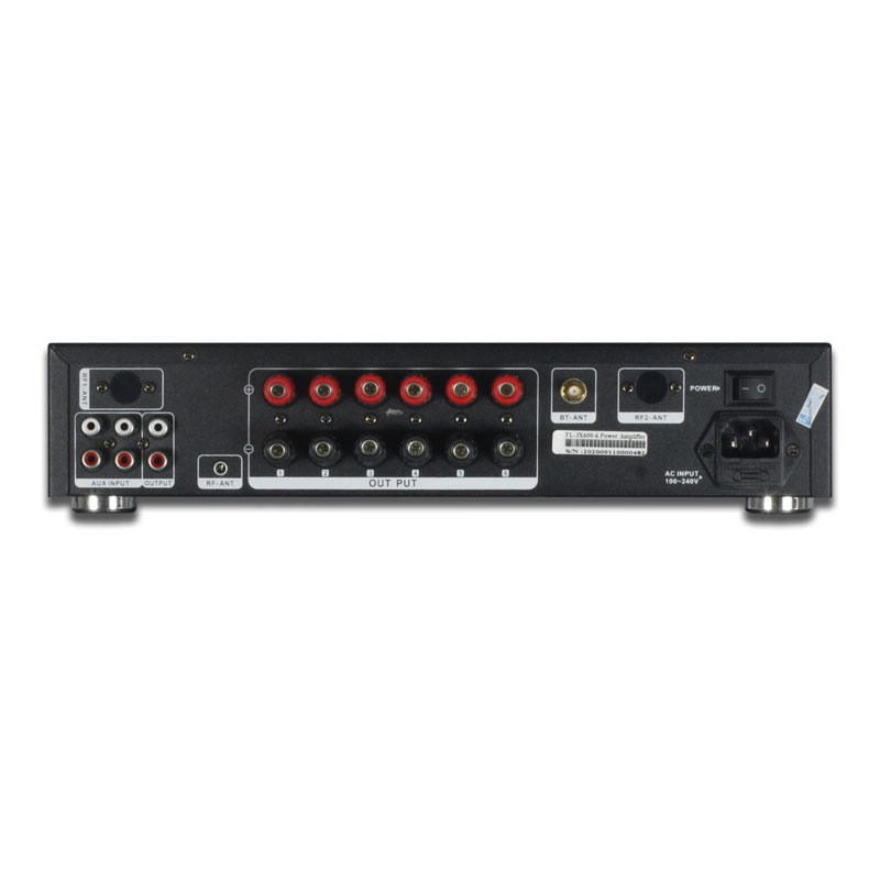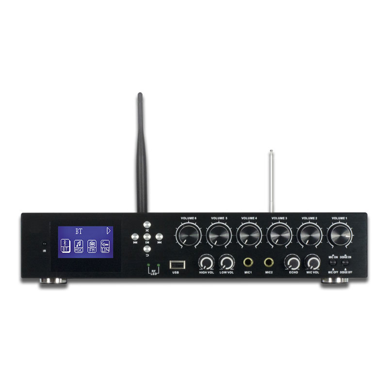 آمپلی فایر تمام اهمی دارای صفحه نمایشگر، دارای 6 کلید ولوم جهت کنترل هر یک از خروجی ها، ورودی USB، بلوتوث، رادیو FM، دو درگاه ورودی AUX، خروجی AUX، دو ورودی میکروفن با کلید های کنترلی میکروفن ها، ریموت کنترل IR، ورودی برق 220 ولت AC